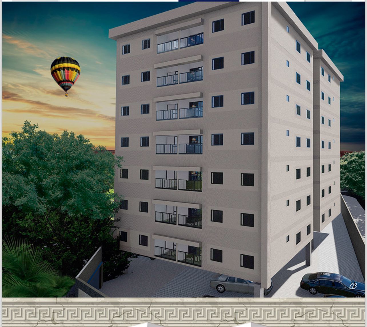 Total de 56 Studios, sendo 42 m² ( externo) e 43 m² ( interno), distribuídos em 7 pavimentos, Pilotis, uma vaga de garagem, lavanderia individual e elevador;